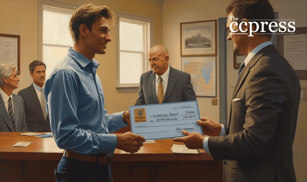 young man receives check painting