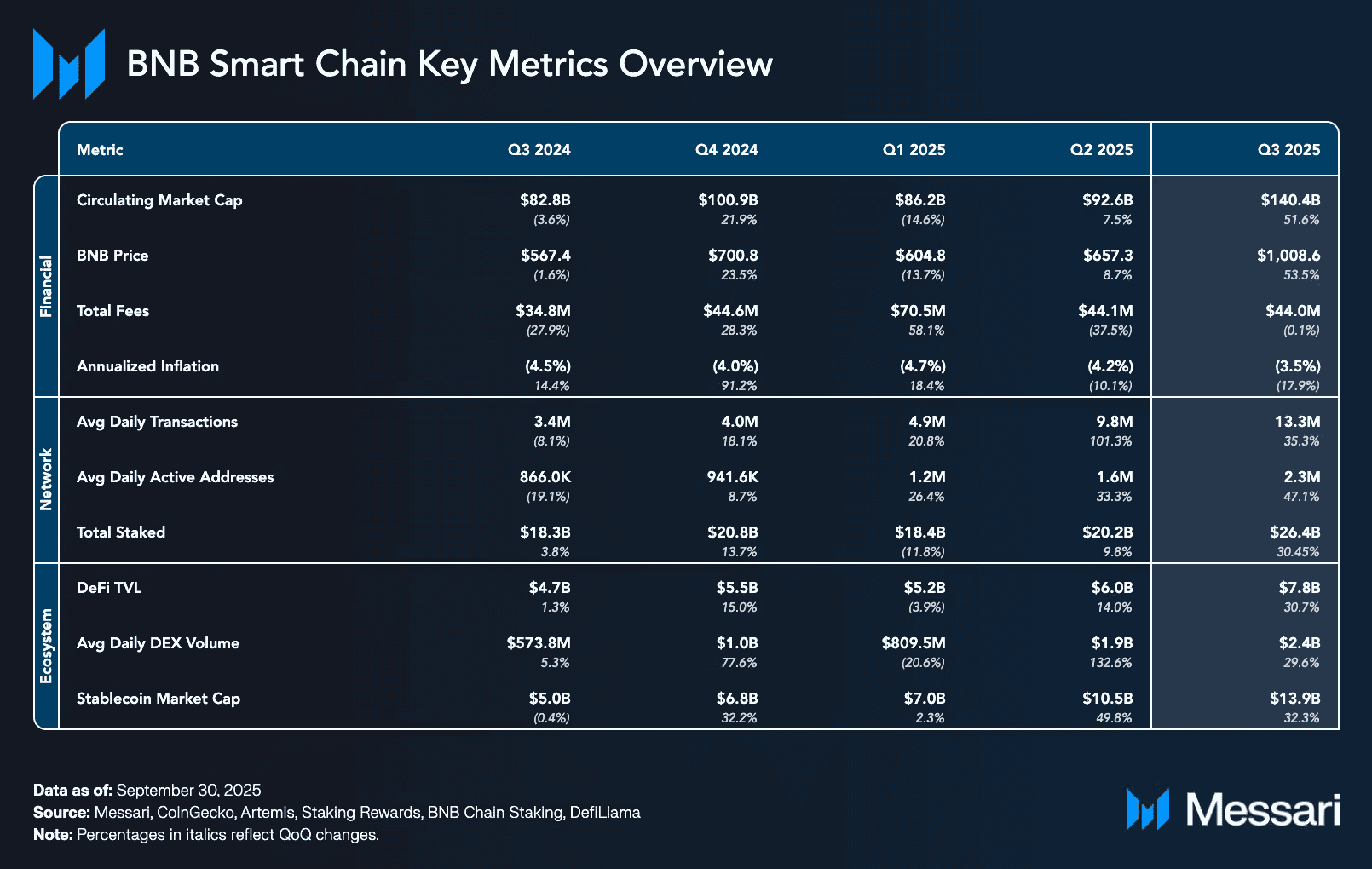 The year 2025 saw BNB Chain begin Q3 with overall growth while enhancing its market valuation and usage. The market capitalization of BNB rose by 51.6% to $140.4 billion. As such, this resulted in an increase in the price of BNB to above $1,000 and surpassed Solana to rank fourth after Bitcoin, Ethereum, USDT, and XRP.
