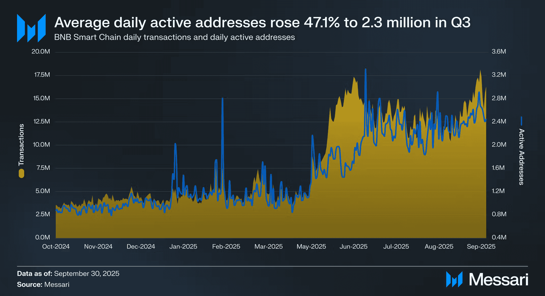 BNB Chain saw considerable growth in on-chain metrics in Q3 2025, with both user engagement and transacting capacity mounting. The blockchain processed an average of 13.3 million daily transactions. This marked a 35.3% increase QoQ. Active user wallets also surged to 2.3 million. This marked a 47.1% QoQ increase.
