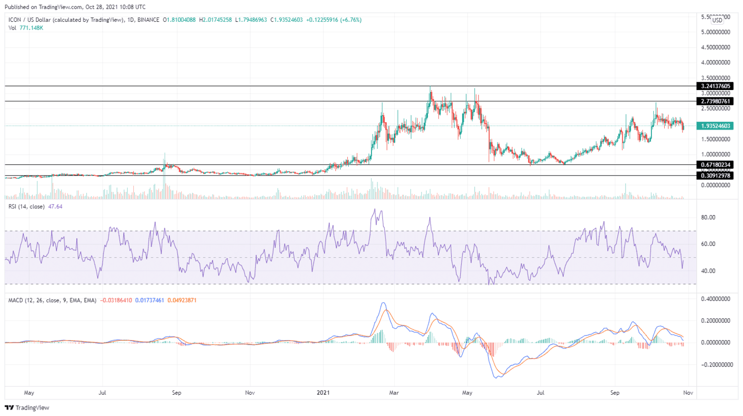 A failure to produce a sustained push above $2.7398 confirmed prices are headed for lower. At this time, ICX is moving to confirm the support level at $0.6718 and retest $0.3091. Although ICX price might test the support, the actions from the MACD and RSI confirm that the buyers are likely to make a comeback.