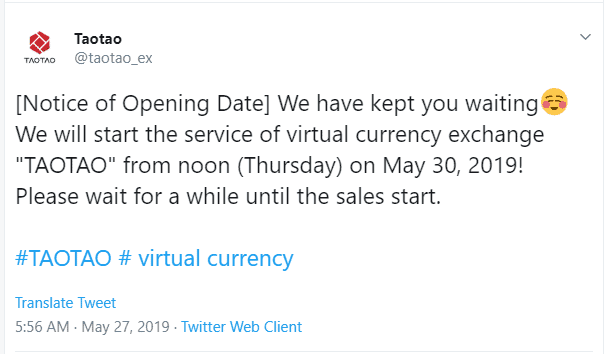 According to a Twitter post made on Monday, Yahoo Japan’s cryptocurrency exchange Taotao will be released on May the 30th.